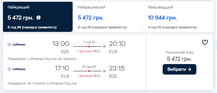 Наприклад, з Жешува можна полетіти 27 липня за 60 євро (приблизно 2500 гривень). Виліт з аеропорту Жешува о 13:00, приліт у Флоренцію о 20:10. У дорозі запланована одна пересадка у Мюнхені. Загальний час подорожі – 7 годин 10 хвилин.