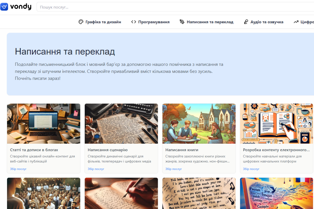 Створити статтю, допис, сценарій, книгу, промову, вірш, текст пісні можна за допомогою штучного інтелекту Vondy.