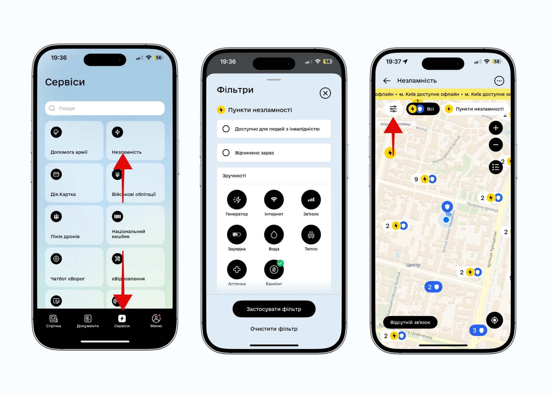 Знайти працюючі під час відключень електроенергії банківські відділення можна за допомогою мапи у застосунку ДІЯ (Android | iOS).