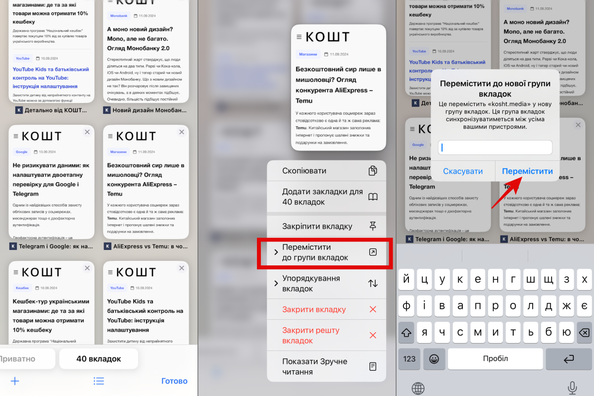 Для створення групи вкладок необхідно довго натиснути на вкладку та вибрати “Додати вкладку до нової групи” – “Перемістити до груп вкладок” й придумати назву.
